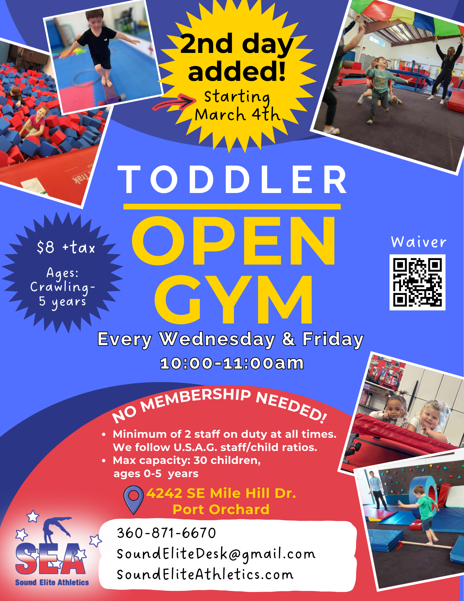 Starting March 4th, we will have Toddler open gym TWICE each week!